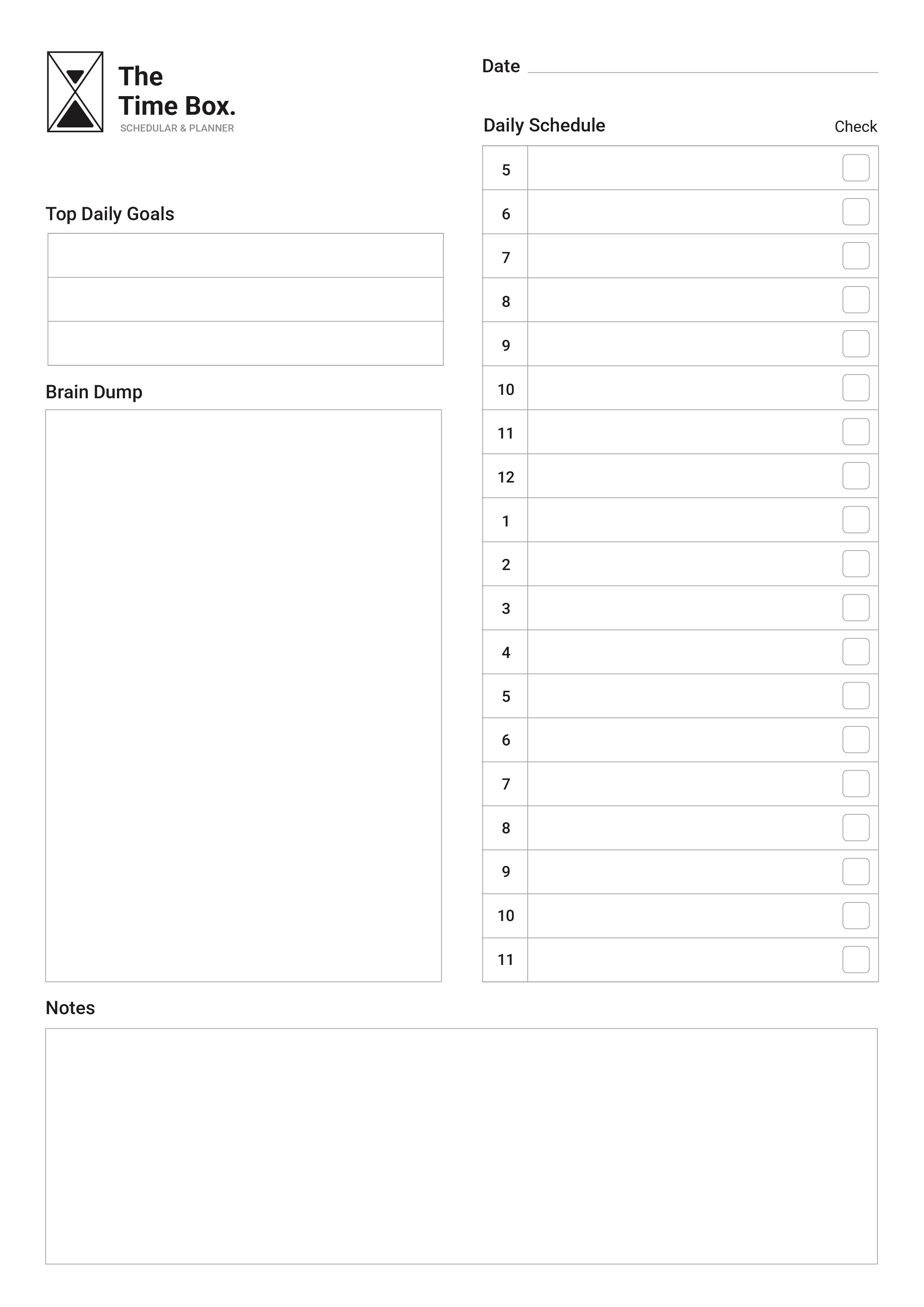 The Time Box (Schedular & Planner)는 단순한 메모장이 아닙니다. 하루를 목표 설정 → 머릿속 정리 → 시간 블로킹 → 기록의 흐름으로 구조화하는 1페이지 일일 플래너입니다.
